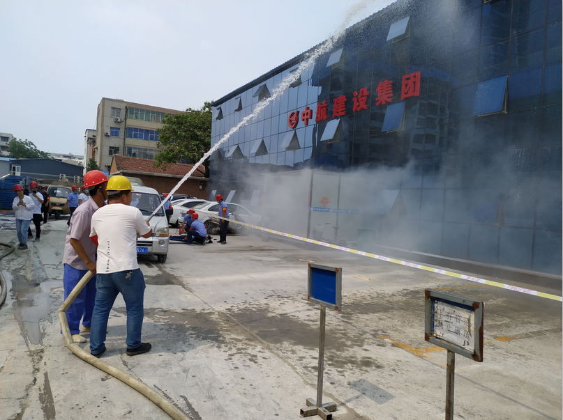 演练模拟项目部某处发生火灾。15:00,消防警报拉响,通讯组发现火情后,立即上报领导,同时,边启动消防应急疏散预案边迅速拨打“119”报警。救护组、抢险组、警戒组等成员按照分工,有条不紊地切断非消防电源、启动消防泵、疏散楼内职工。